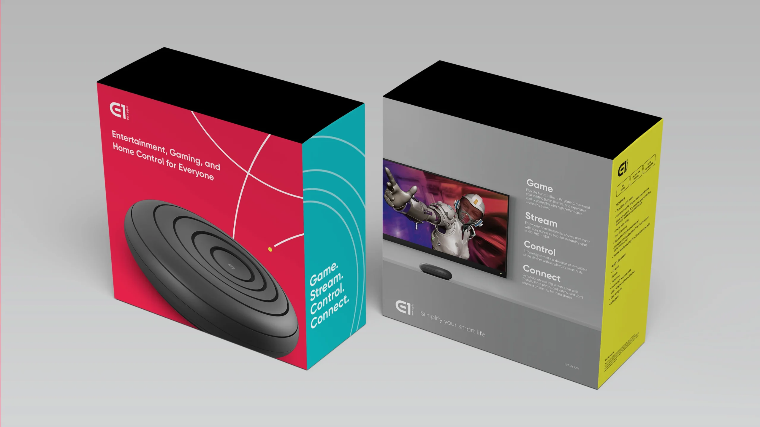 The Ericsson E1 reimagines home entertainment and IoT in a single plug-in device that connects directly to your TV. It unifies streaming, gaming, and smart-home control in one intuitive hub. No more juggling remotes or apps.