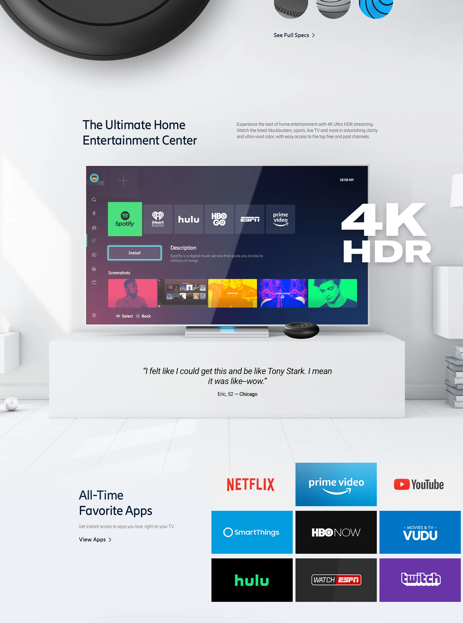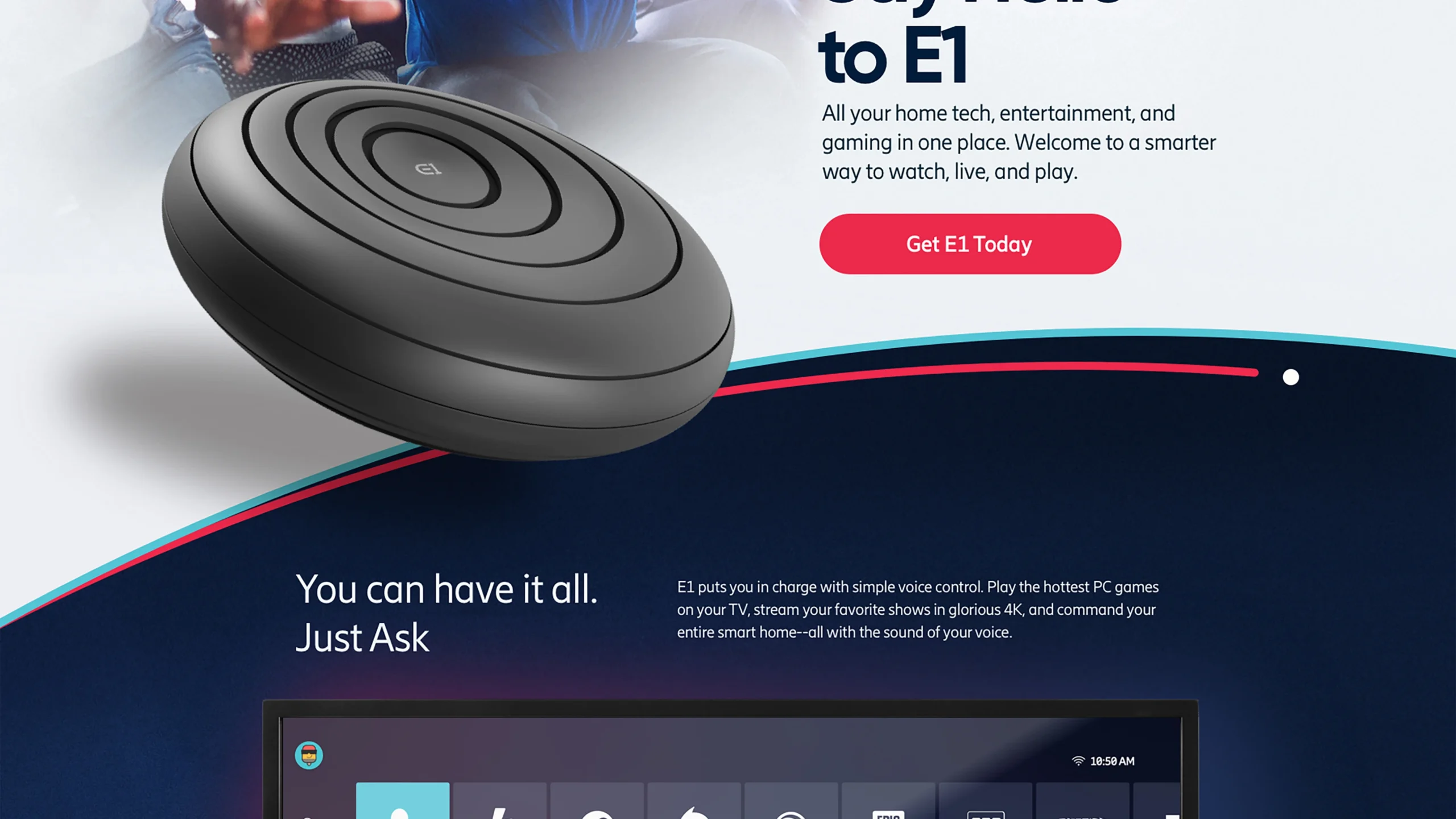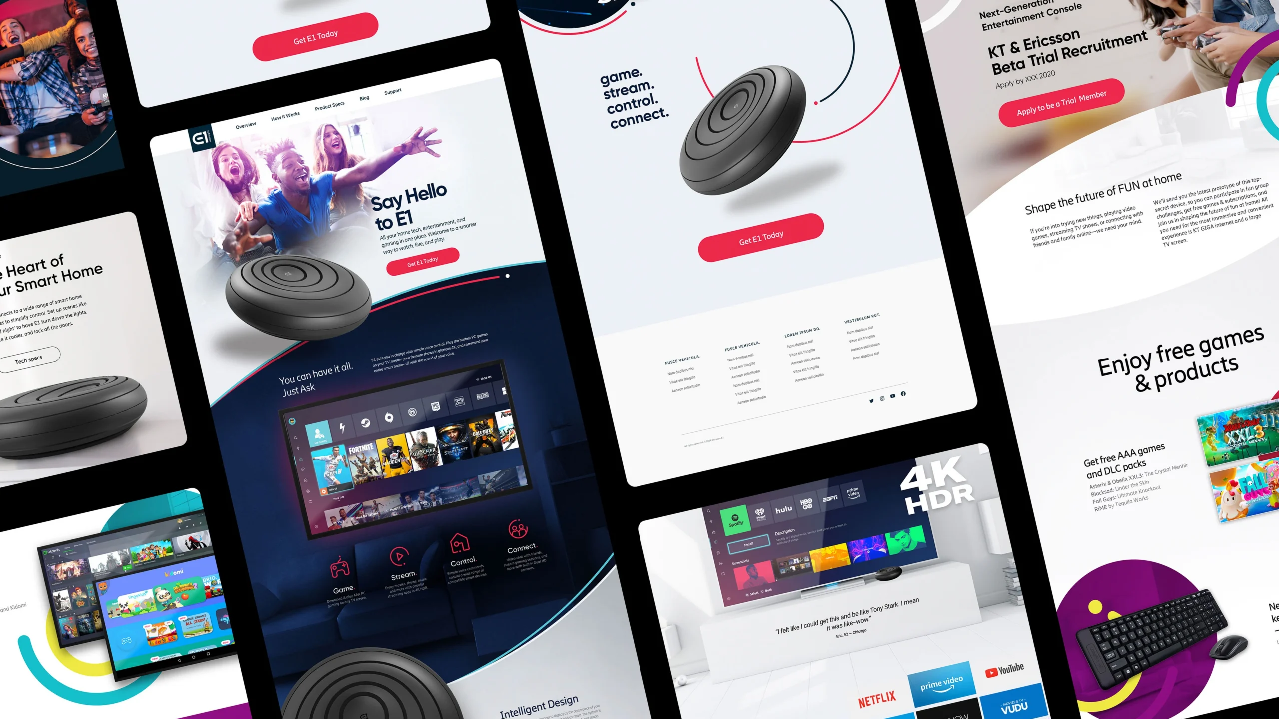The homepage presents the product in action with clear, memorable messaging. Feature pages explain streaming, gaming, and smart-home capabilities, while the brand story and partner sections reinforce credibility across platforms.