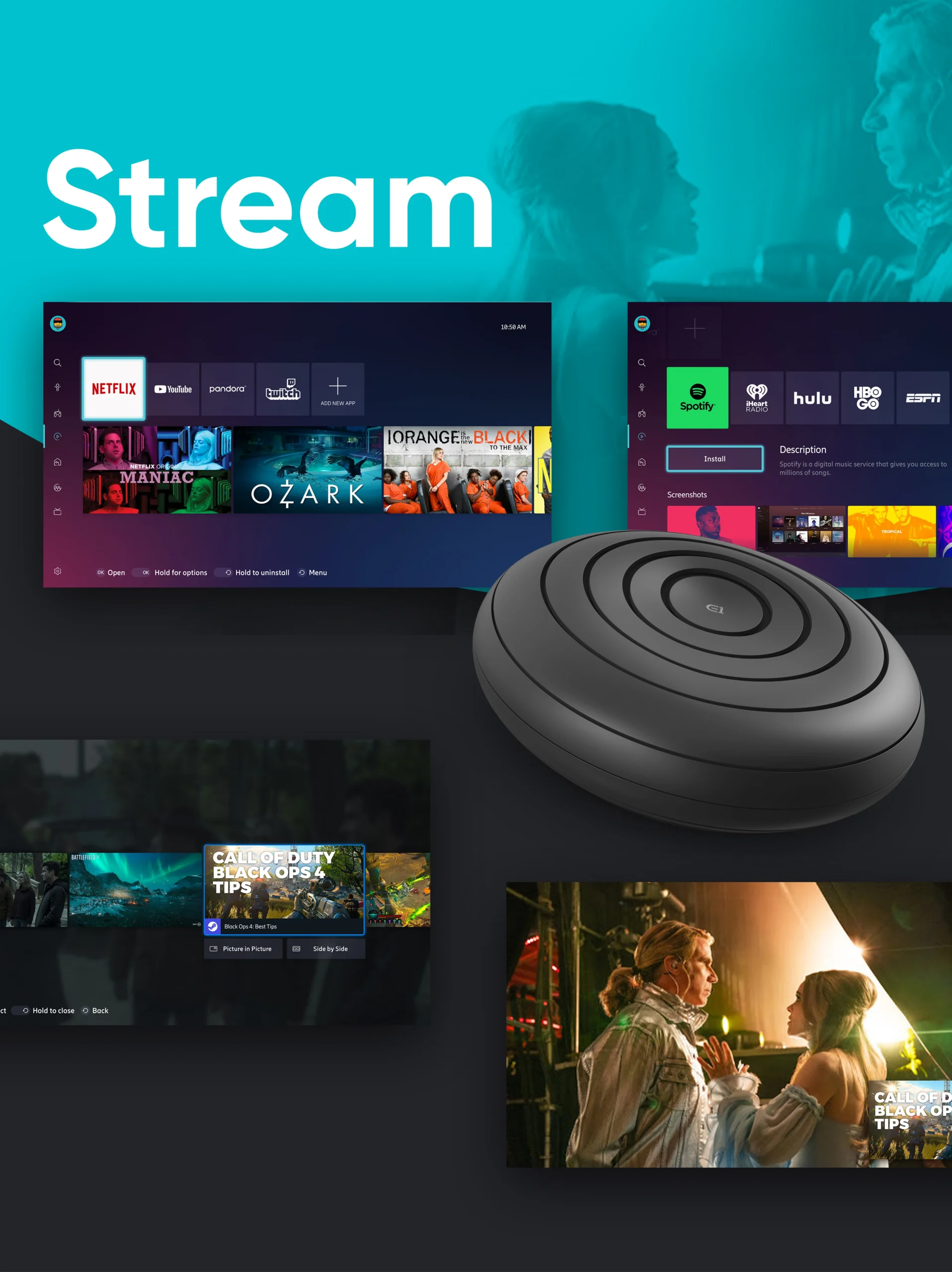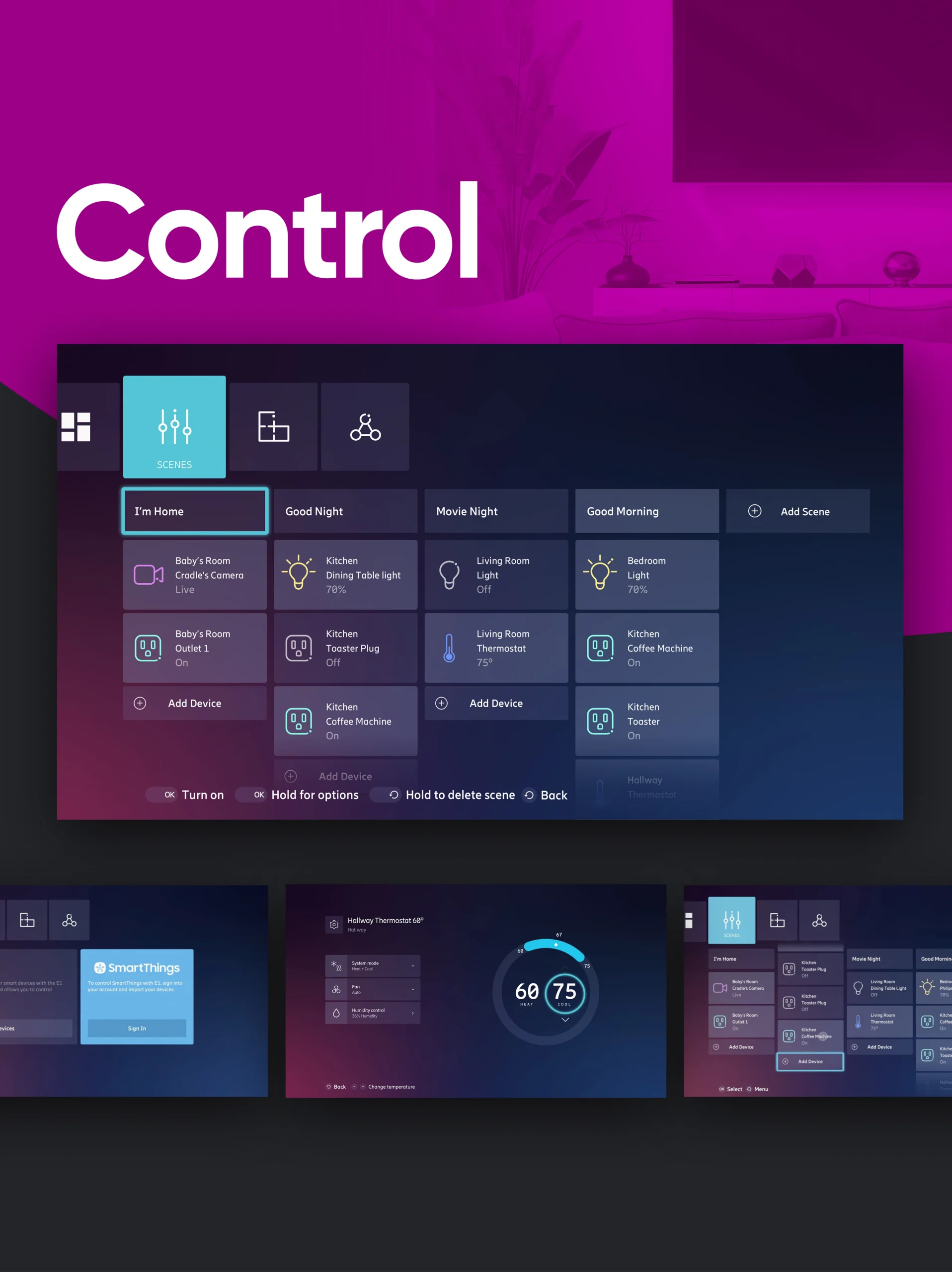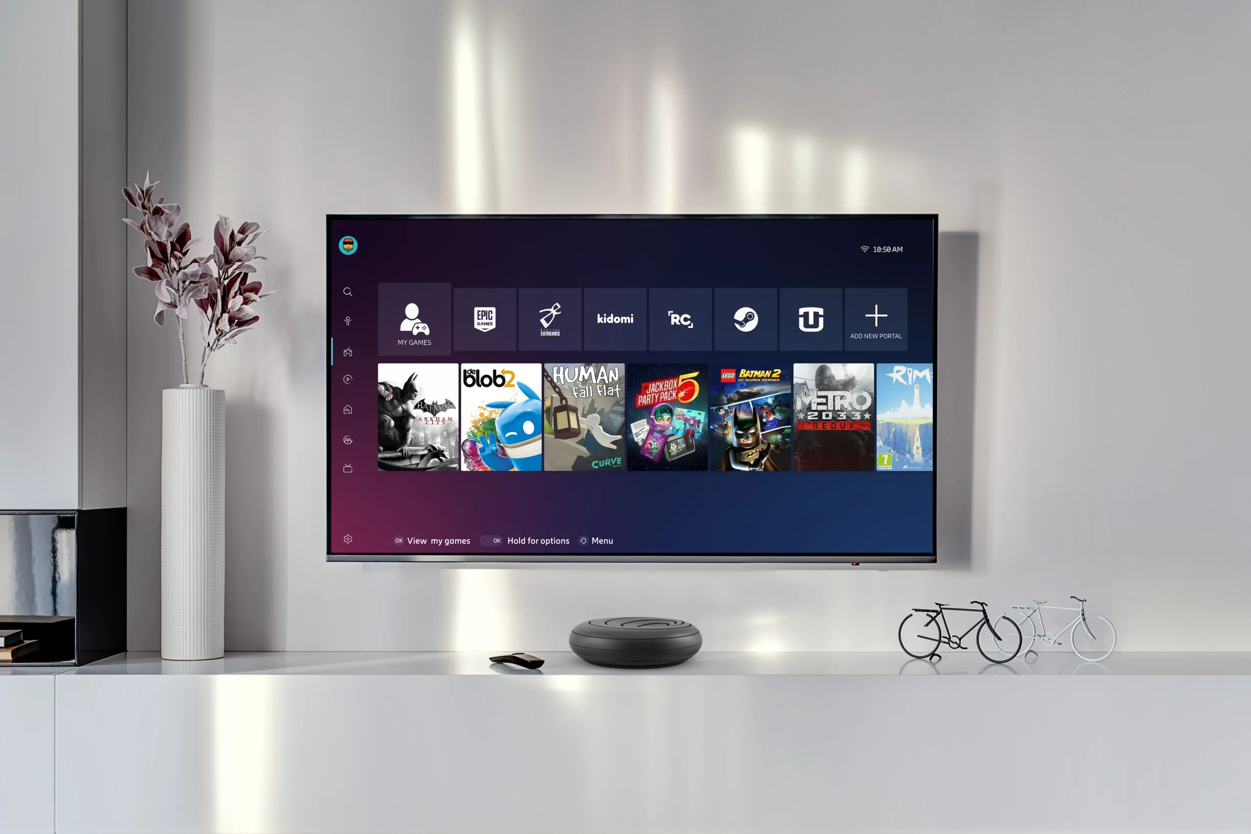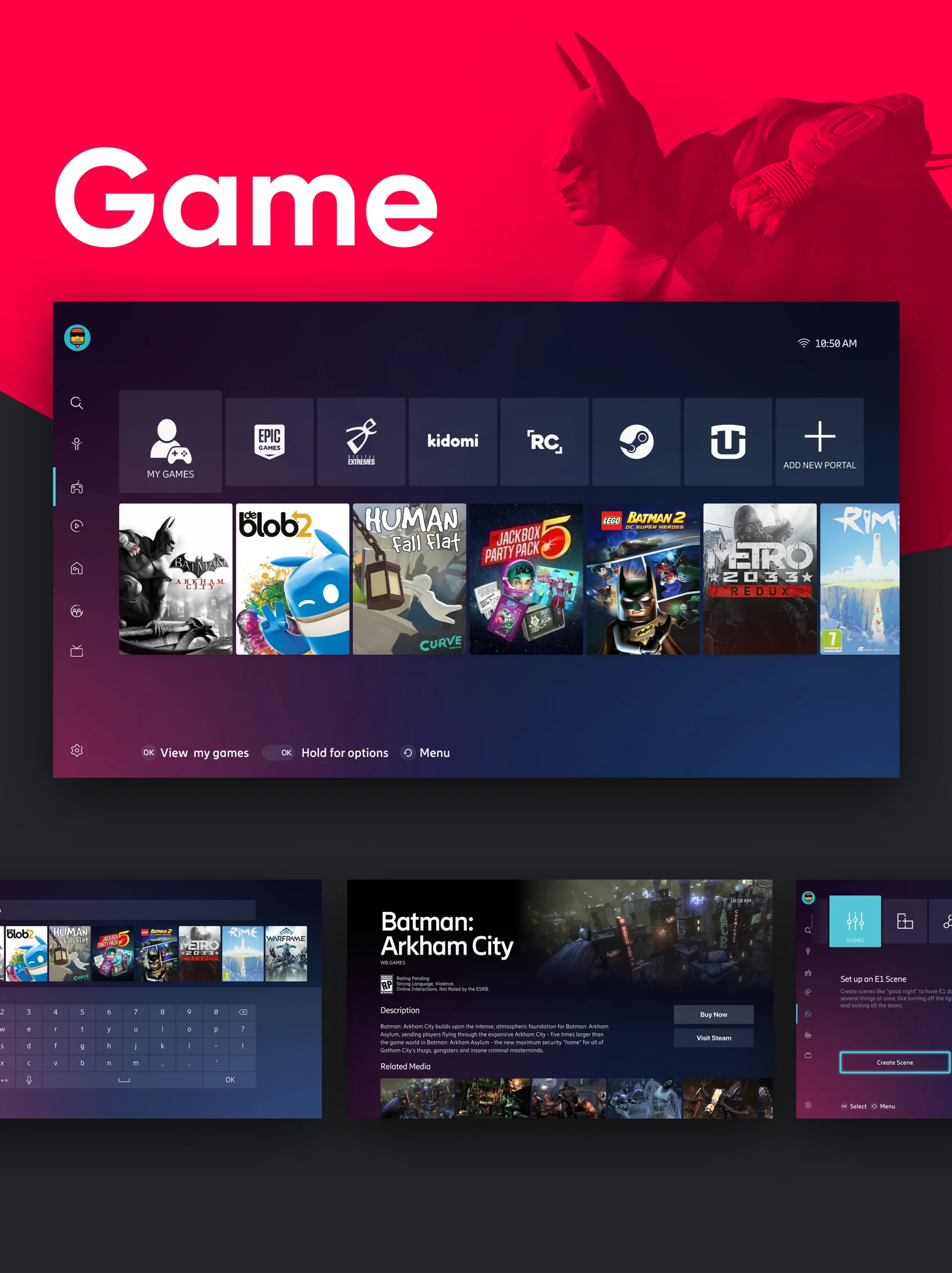 We structured the experience around Stream, Connect, Play, and Control modes, allowing users to stream, game, and manage connected devices seamlessly. We also developed the system architecture for single sign-on, universal search, and smooth transitions, making complex actions feel natural. Accessibility and ergonomics guided every choice, ensuring comfort and clarity for every user, in every home.