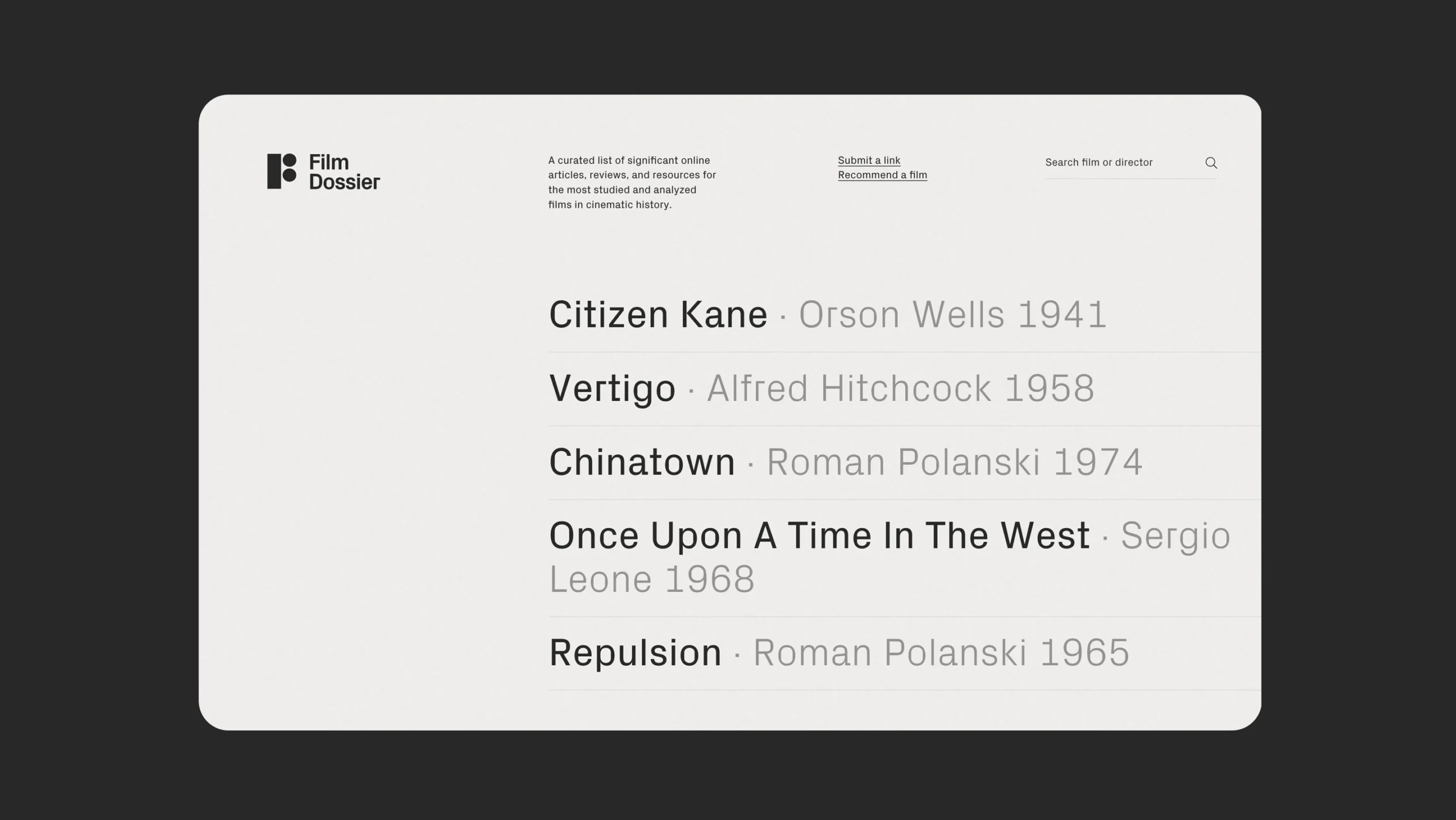 Film Dossier is a curated platform highlighting significant reviews, articles, and resources on the most analyzed films in cinema history. The visual identity is anchored by a minimal symbol that doubles as the letter F and the form of a vintage film camera, capturing both the critical and archival spirit of the project.